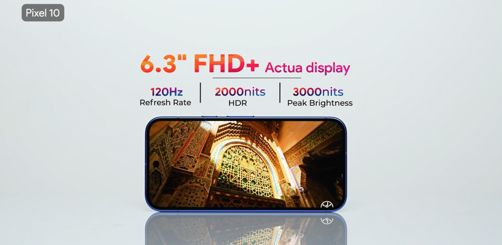 Google didn’t compromise on the screen, not even for the lowest model. The Pixel 10 boasts a 6.3-inch OLED “Actua Display” with 1080×2424 resolution and a 120 Hz adaptive refresh rate.